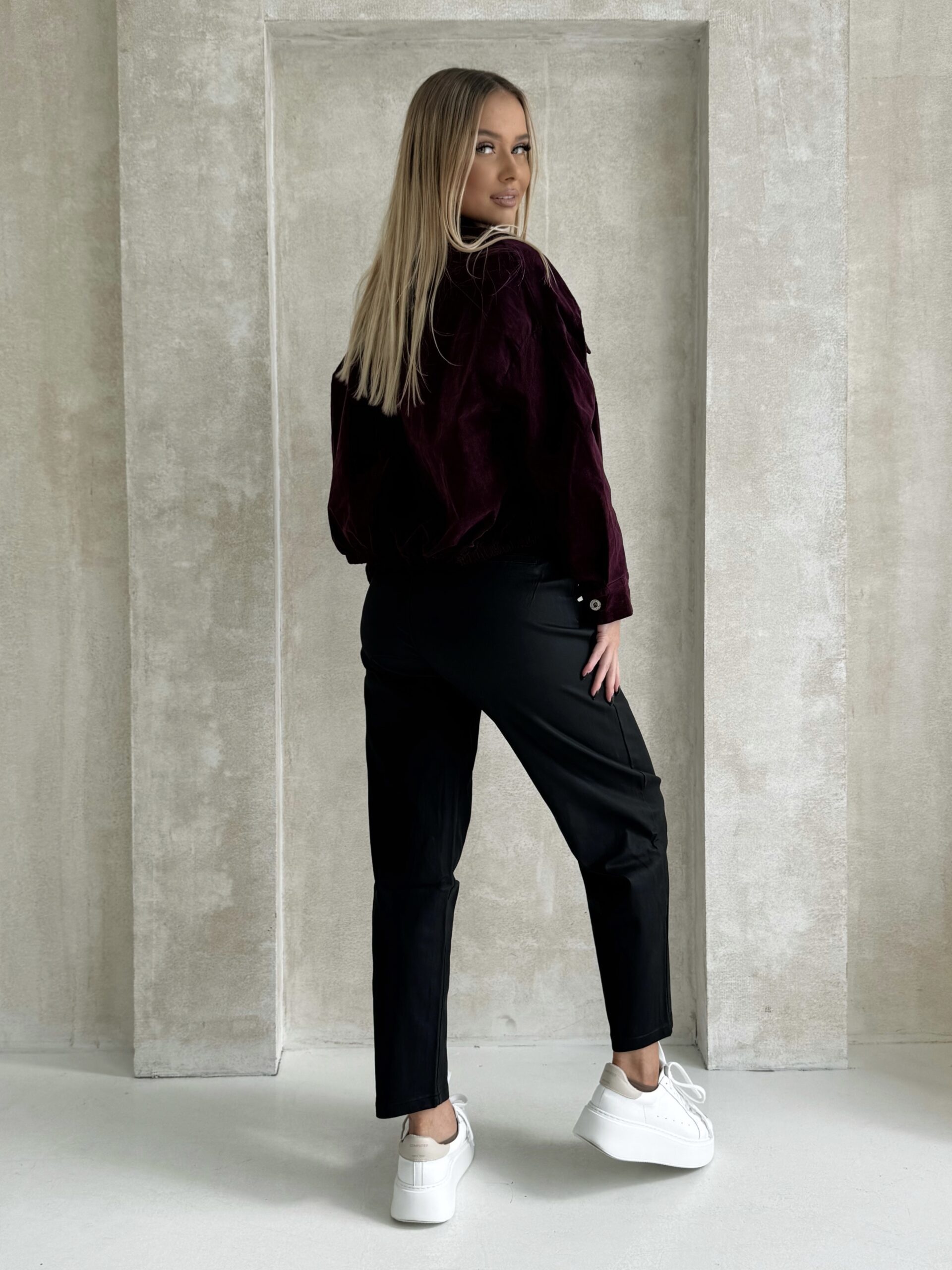 Model z pięcioma kieszeniami, zapinany na guzik i suwak błyskawiczny. Nogawki delikatnie zwężane ku dołowi. Logowany guzik oraz naszywka na tyle produktu.