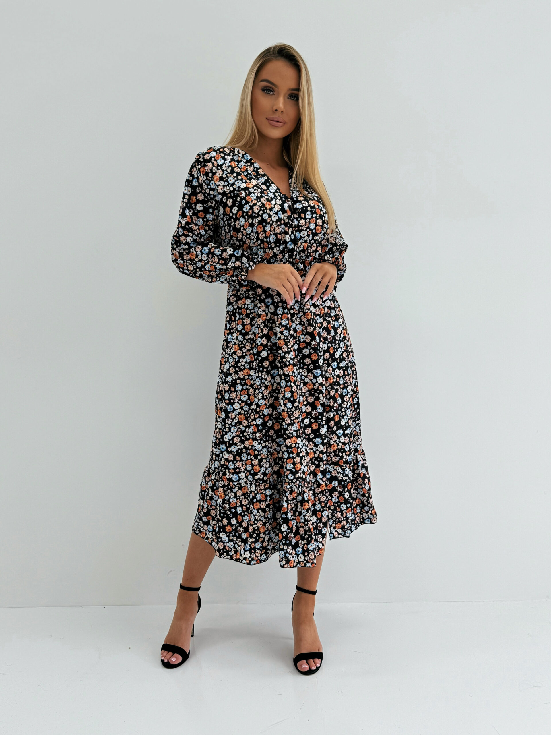 ✅Delikatny wzór kwiatowy nadaje sukience uroku, a rozcięcie i falbana u dołu dodają lekkości i elegancji.